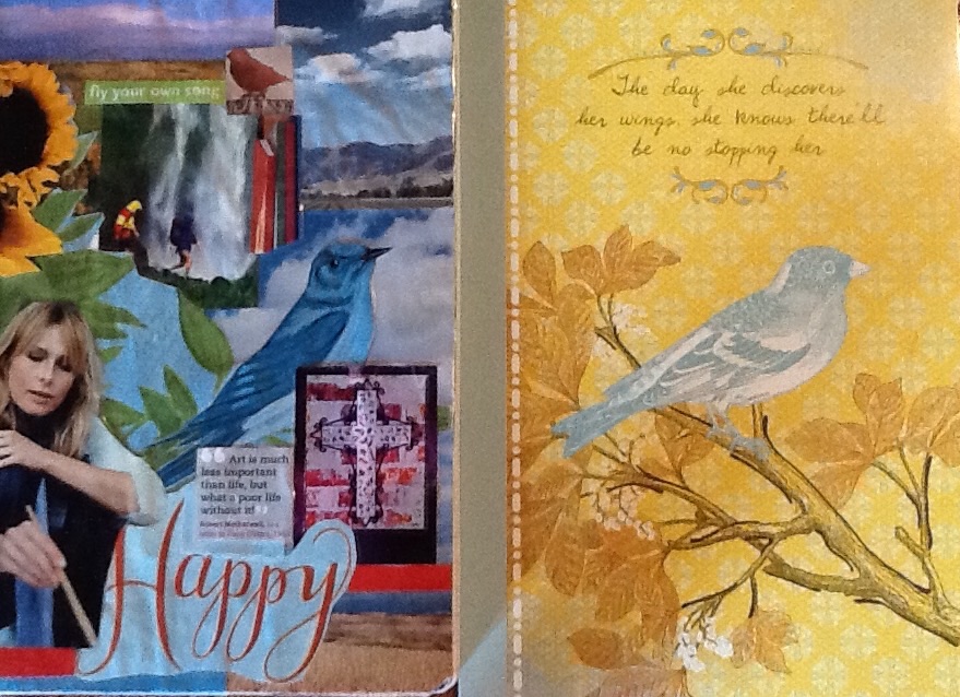 Three months later I was in a small town with my high school girlfriends. We were in a huge, multi-level antique/craft mall with individual booths. At one point I wandered off by myself. In a certain booth, far away from my friends, I discovered a stack of journals. I flipped through and found the one you see on the right half of the attached photo. I was struck by the likeness of the bird to my own journal as I read the quote on the cover. “The day she discovers her wings, she knows there’ll be no stopping her.” I like going full speed ahead! The quote clearly related to the image of a bird let out of a cage. I wanted to purchase this journal. I felt it was mine! But then I looked at the back cover, at the bottom, where there was a continuation of the quote in the same handwriting….”It is here where she must begin to tell her story.” YIKES!! I put the journal back instantly and walked away. I heard my name called over the loud speaker. My friends thought I was lost!
