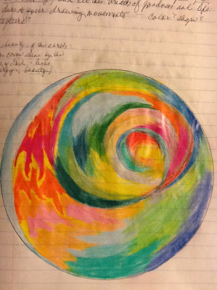 This is a sketch I did in a journal of the colors expressing God’s creation. I wish I had done it on unlined paper, but I still love the feel of these colors being born through the breath of God!
